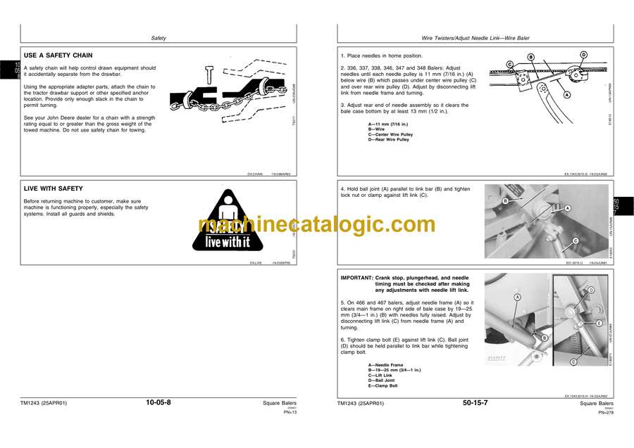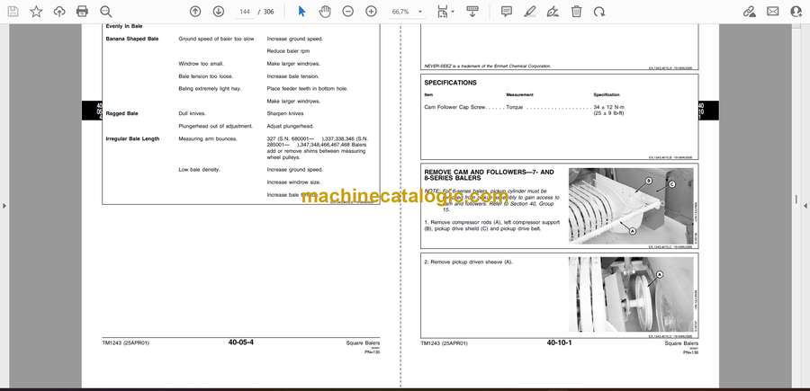 These square balers spend their lives eating windrows in dusty fields, long days behind a tractor, and they only make money when the knotters tie and the flakes stay uniform. This technical manual is what I’d pull out when I need to trace a problem from the pickup to the bale chute, or verify settings before a long run. Say you’ve got bales coming out banana-shaped and the knotters occasionally missing—this is the book that lets you systematically inspect clearances, align linkages, and test adjustments instead of just guessing.
