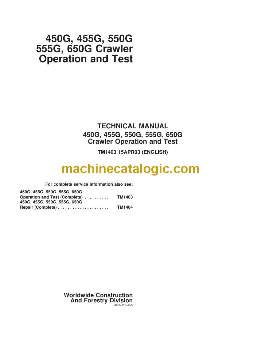 John Deere 450G, 455G, 550G, 555G, 650G Crawler Operation and Test Technical Manual (TM1403)