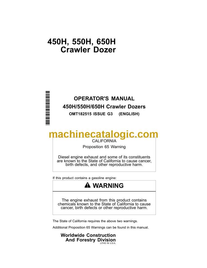 John Deere 450H, 550H, 650H Crawler Dozer Operator Manual (OMT182515)