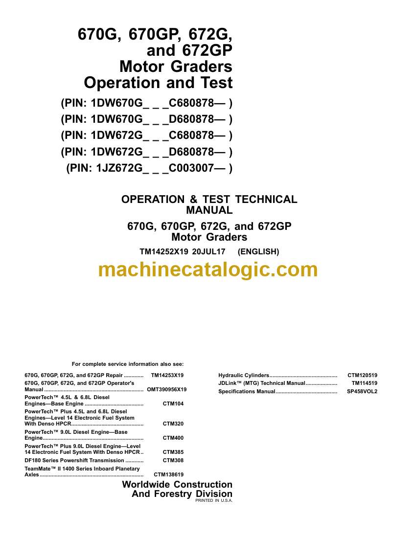 John Deere 670G, 670GP, 672G, and 672GP Motor Graders Operation and Test Technical Manual (TM14252X19)