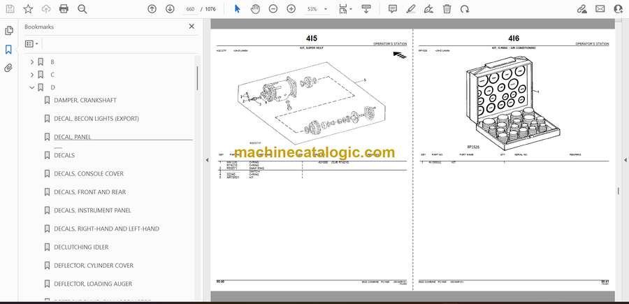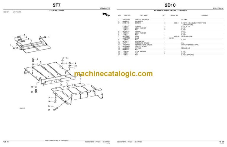 Out in corn, the 8820 and 844 head live in dust, stalks, and vibration all day, so sooner or later you’re chasing worn chains, bent snouts, or oil leaks. This parts catalog is what I use to visually break down the combine and corn head, match every component to the right part number, and see how pieces relate. If I’ve got a row-unit gearbox dripping oil, I’ll open this book to trace the shaft, bearings, and seals in the exploded view so I don’t miss the little O-rings or shims when I order.