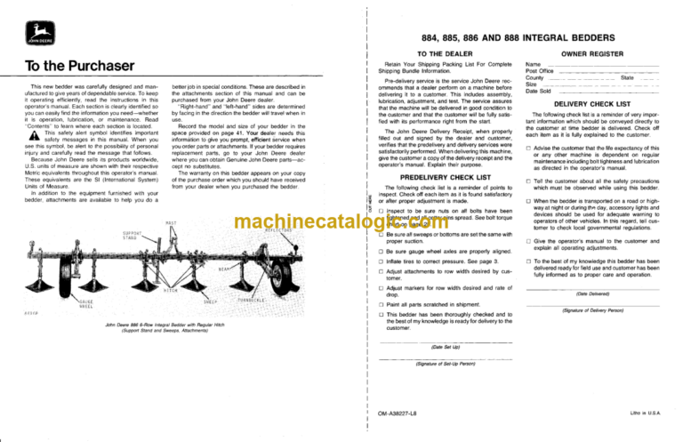 John Deere 884, 885, 886 and 888 Integral Bedders Plow Operator’s Manual (OMA38227)