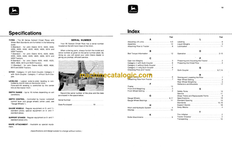 John Deere 90 Series Subsoild Chisel Plows INDEX: