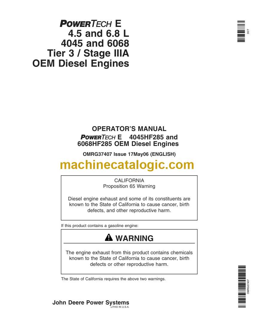 John Deere POWERTECH E 4.5 and 6.8 L 4045 and 6068 Tier 3, Stage 3A OEM Diesel Engines Operator Manual (OMRG37407)