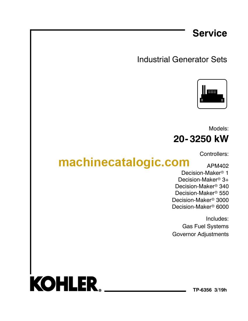 These Kohler industrial generator sets usually sit in plants, data centers, or standby rooms, running hard when the grid drops or the load spikes. This service manual is what I’d keep on the cart when I’m tracing a no-start, chasing an unstable voltage issue, or confirming a governor problem before ordering parts. It walks you through how to logically isolate a fault on these 20–3250 kW units instead of just throwing components at it—for example, when the set won’t take load after a long idle period, you can follow the checks to verify controls, fuel, and protection circuits in a sensible order.