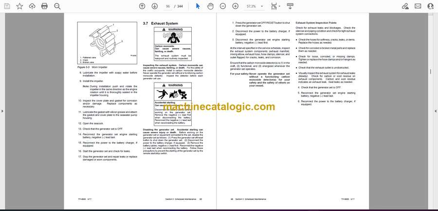 These Kohler marine generator sets usually live in hot, cramped engine rooms, supplying hotel power and backup power while the vessel’s underway or at dock. This service manual is what I’d keep open when I need to trace a no-start, an unstable frequency, or a shutdown under load and prove whether it’s a sensor, fuel issue, or control problem before I order parts. For example, if a unit trips off as soon as the load comes on, I’d use this book to walk through the checks in order—fuel, governor, electrical side—so we fix the cause, not just the symptom.