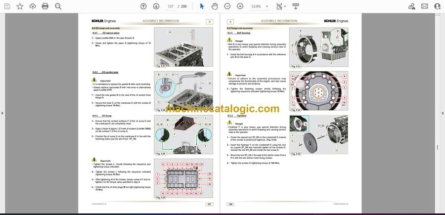 These Kohler KDI 1903TCR and 2504TCR engines usually live in compact loaders, small telehandlers, generators and industrial gear that work hard in dust, mud and temperature swings. This workshop manual is what I’d pull when we’re doing a full teardown or major repair and want the engine back in the frame once, not twice. For example, if a machine comes in with hard starting and low power after a previous “quick fix,” this book lets you strip, inspect, and reassemble the engine and fuel system in a structured way so you can verify each step and avoid rework.