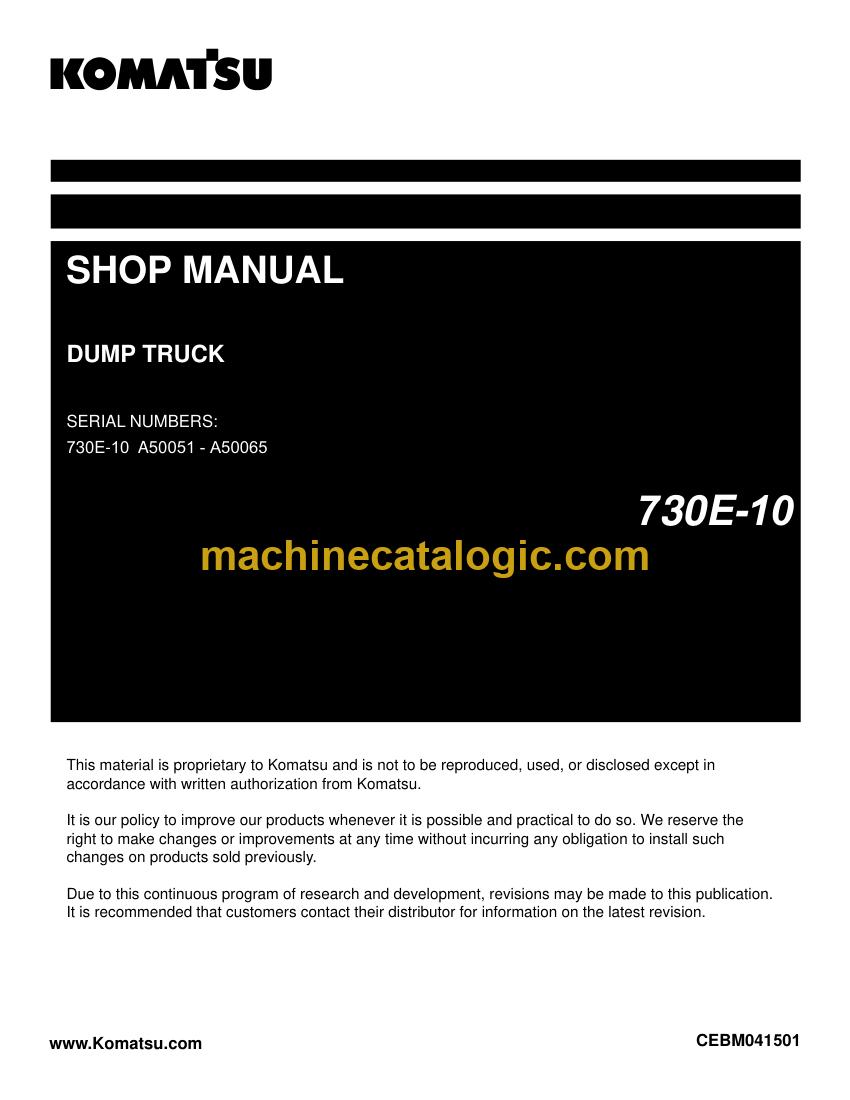 The Komatsu 730E-10 Rigid Dump Truck Shop Manual (CEBM041501) is meant for the big off‑highway trucks you’ve got loading out of shovels in mines or large earthmoving jobs, running long shifts and burning through tires and brakes. The people who usually reach for this kind of manual are shop techs, mine maintenance planners, and fleet managers who need to keep availability up and guesswork down. They’re trying to plan repairs, shorten diagnostics, and make sure parts and labor are lined up before the truck even hits the bay.