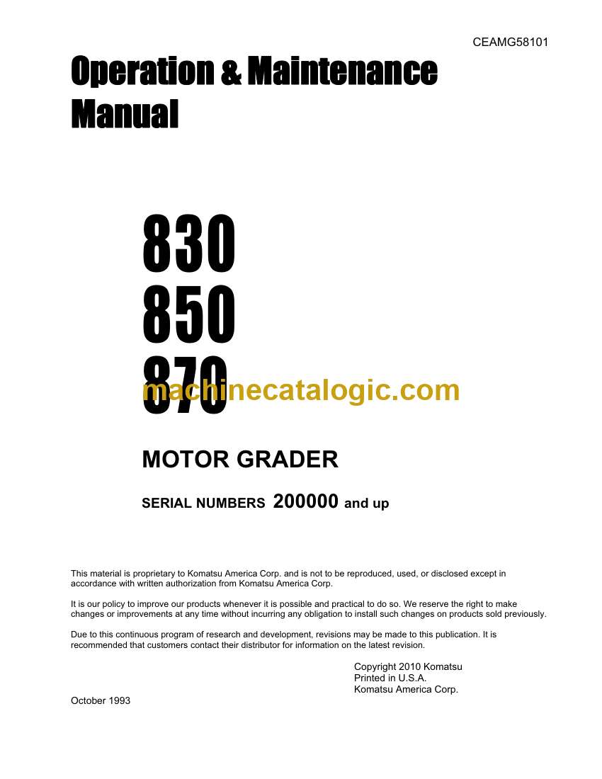 Komatsu 830, 850, 870 Motor Grader Operation and Maintenance Manual (CEAMG58101)