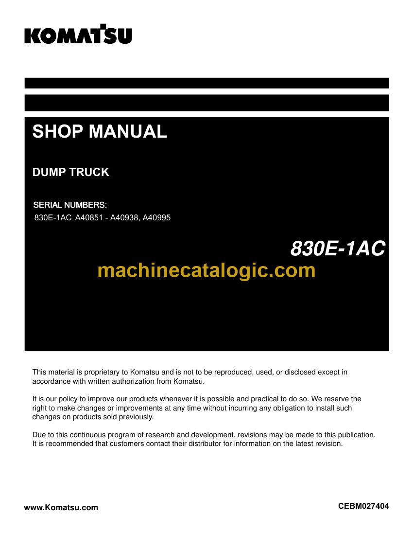 This shop manual is aimed at field techs, shop mechanics, and fleet managers who schedule and oversee heavy repairs on Komatsu 830E-1AC trucks. It’s not an operator’s handbook or a quick daily check guide; operators and trainees are better off with the Operation & Maintenance manual instead.