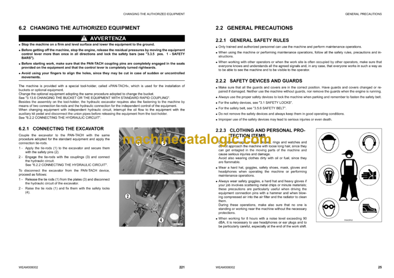 3.13.6 CHANGING THE BUCKET OR THE EQUIPMENT WITH STANDARD RAPID COUPLING