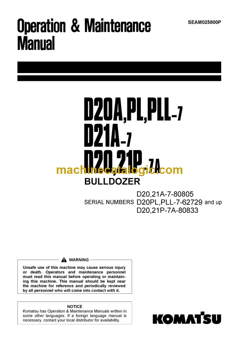 Komatsu D20A-7, D20PL-7, D20PLL-7, D21A-7, D20-7A, D21P-7A Bulldozer Operation and Maintenance Manual (SEAM025800P)