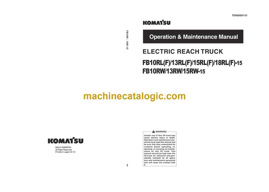 Komatsu FB10RL-15, FB13RL-15, FB15RL-15, FB18RL-15, FB1PRW-15, FB13RW-15, FB15RW-15 Electric Reach Truck Operation and Maintenance Manual (TEN00597-01)