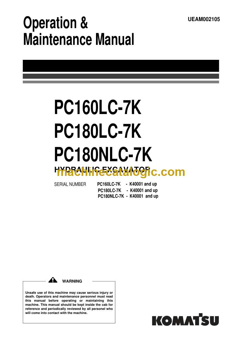 Komatsu PC160LC-7, PC180LC-7K, PC180NLC-7K Hydraulic Excavator Operation and Maintenance Manual (UEAM002105)