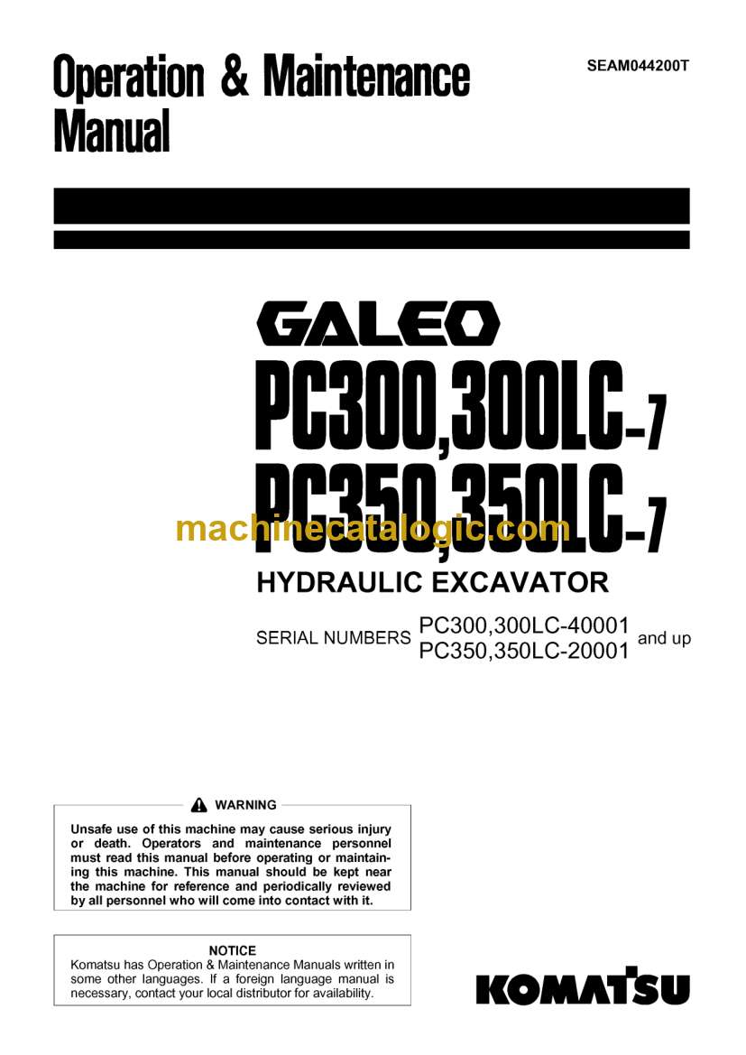 Model: PC300, PC300LC-7, PC350, PC350LC-7 Hydraulic Excavator