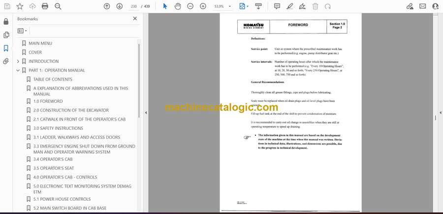 Out on a mine or quarry, the PC3000-1 shovel is working hard all day, loading trucks and digging in abrasive material. This Operation and Maintenance Manual is what I’d keep handy to plan routine service, set up a sensible inspection rhythm, and make sure the shovel stays reliable between major overhauls. If, for example, an operator reports slower cycle times and hotter-than-usual hydraulics, I’d use this book to verify daily and weekly checks, trace likely problem areas, and confirm we’re not missing basic care that leads to costly downtime.