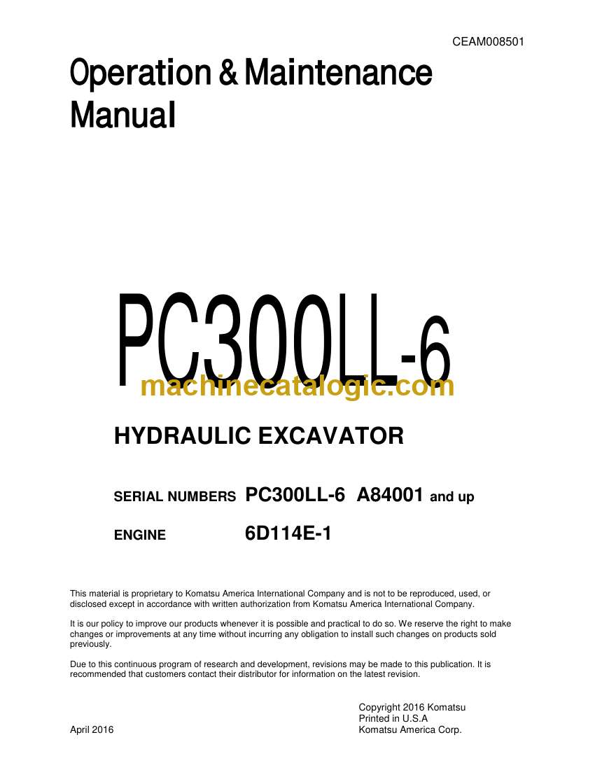 Komatsu PC300LL-6 Hydraulic Excavator Operation and Maintenance Manual (CEAM008501)
