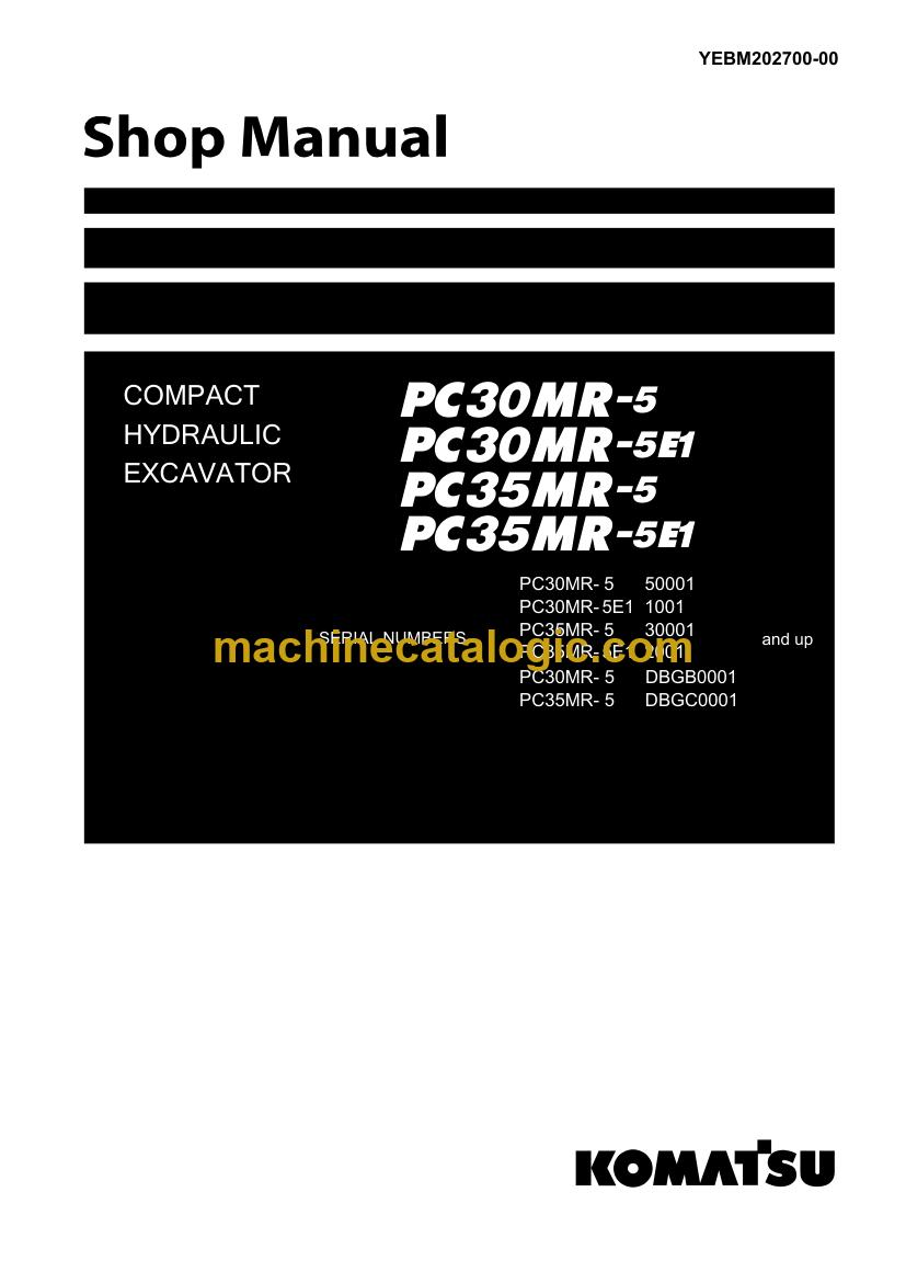 A: The Komatsu PC30MR-5, PC30MR-5E1, PC35MR-5 Crawler Excavator Shop Manual walks through diagnostic procedures, disassembly sequences, and workshop-level checks used during major repairs.