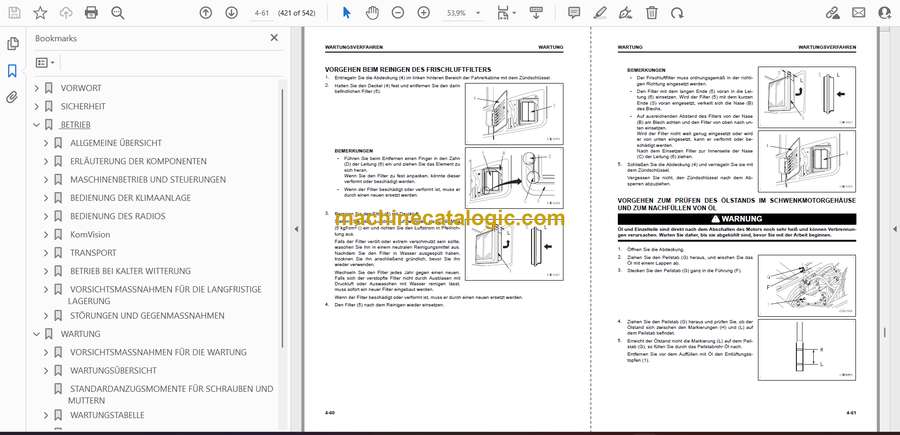 On a PC360NLC-11 that spends its days loading trucks, digging foundations, or working in demolition on rough sites, this Operation and Maintenance Manual is what I’d keep close to keep the machine predictable and available. It helps you set a sensible service rhythm, know what to look at every day and every few hundred hours, and decide what really needs attention before it fails. For example, if the swing feels sluggish or noisy, this book guides you through basic checks—inspection points, daily routines, and what to verify before you call in deeper diagnostics.