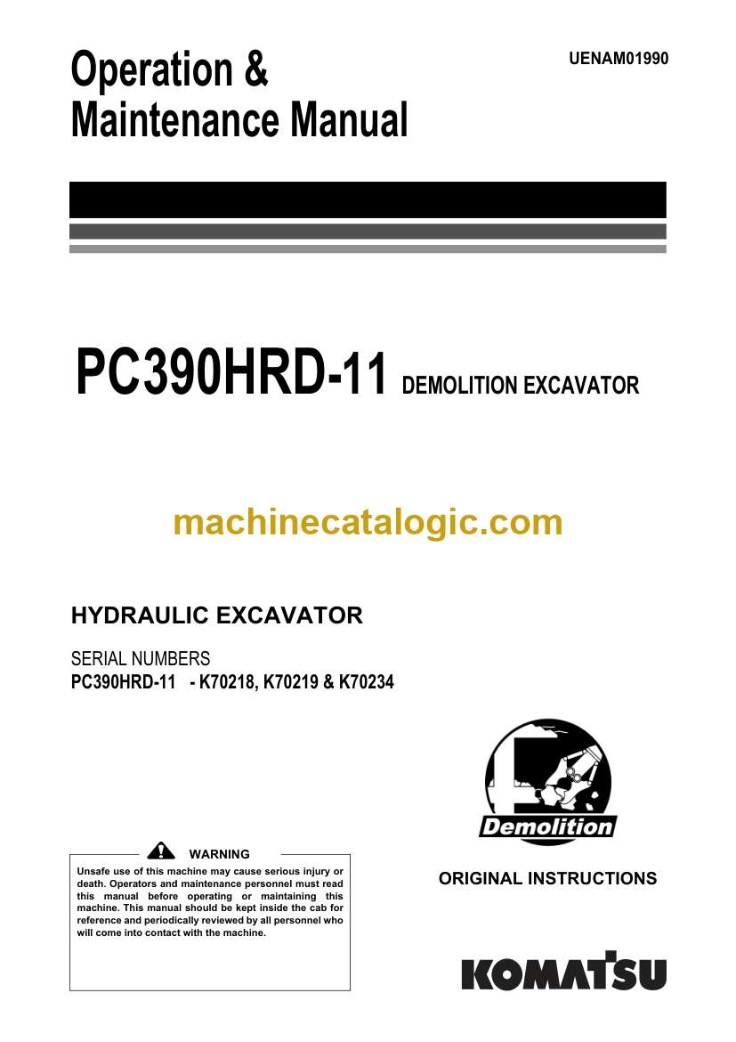 Komatsu PC390HRD-11 Hydraulic Excavator Operation and Maintenance Manual (UENAM01990)