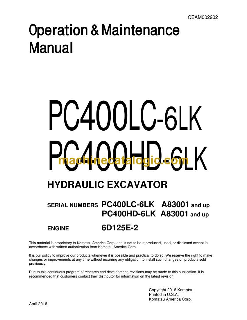 Model: PC400LC-6LK, PC400HD-6LK Hydraulic Excavator