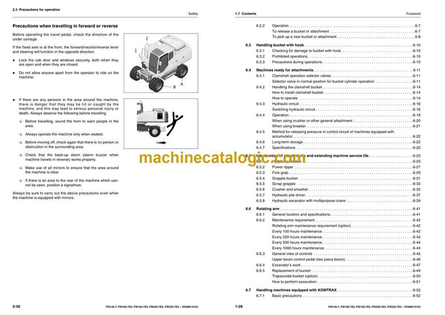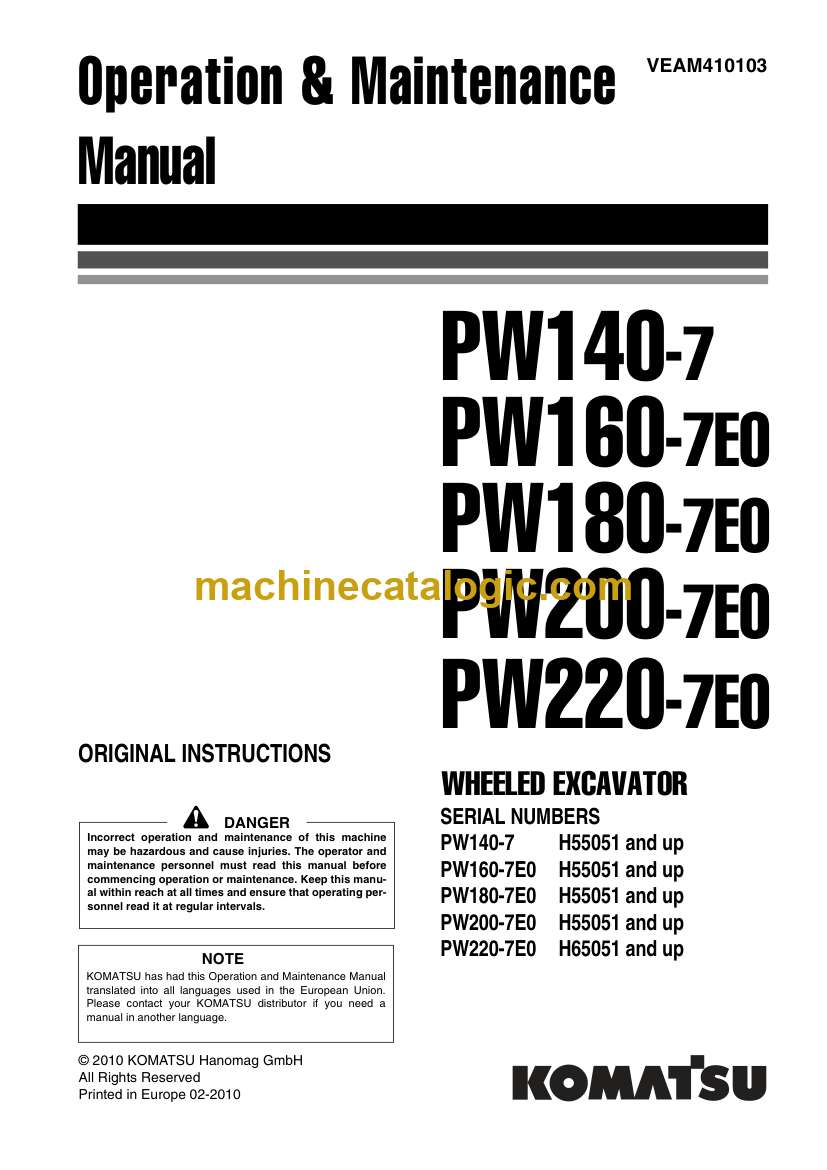 Komatsu PW140-7, PW160-7E0, PW180-7E0, PW200-7E0, PW220-7E0 Wheeled Excavator Operation and Maintenance Manual (VEAM410103)