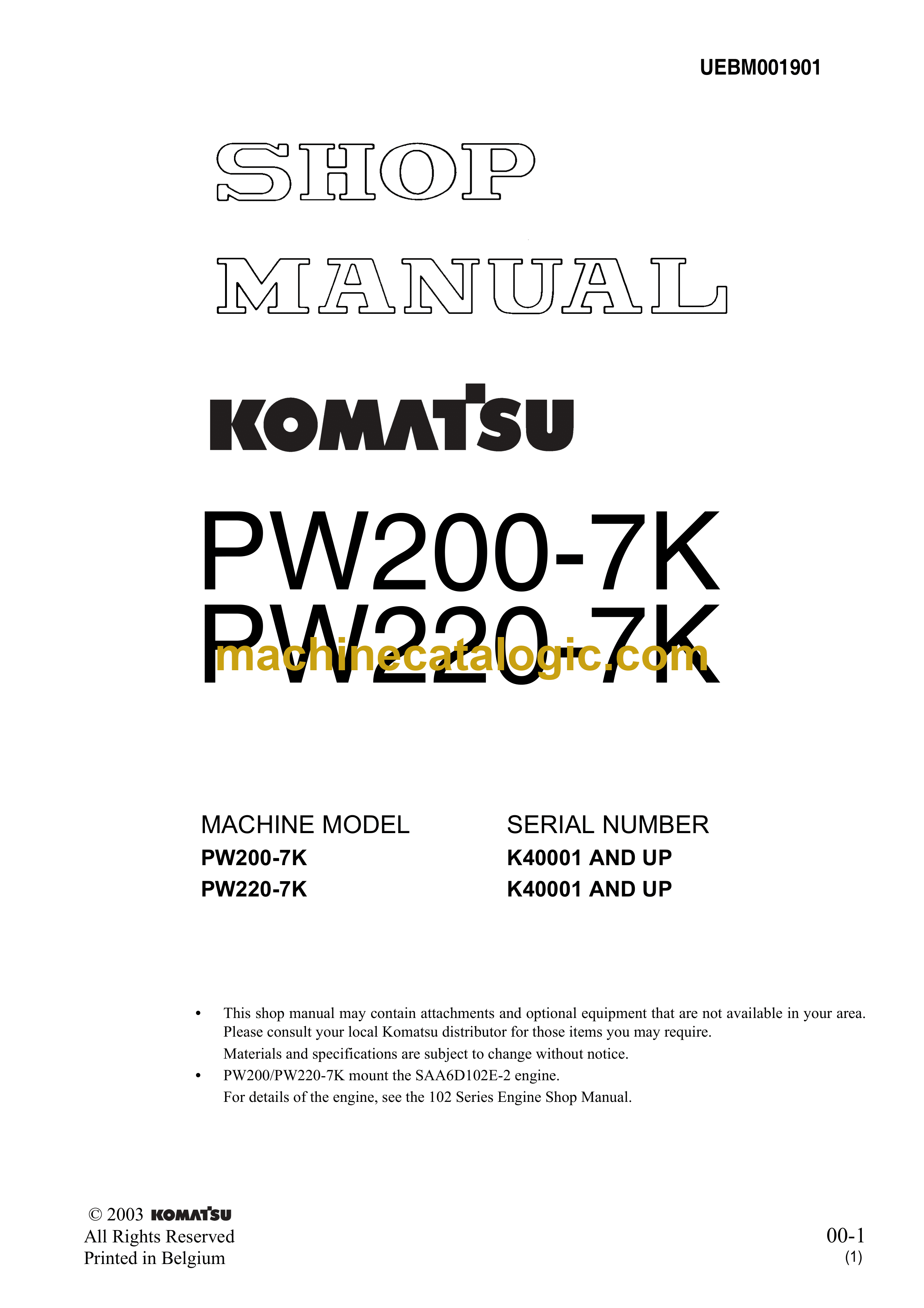 Komatsu PW200-7K, PW220-7K Wheeled Excaxvator Shop Manual (UEBM001901)