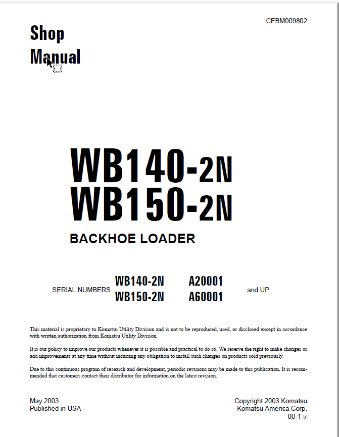 Komatsu WB140-2N, WB150-2N Backhoe Loader Shop Manual (CEBM009802)