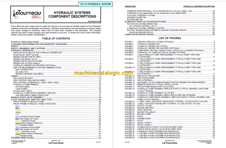 The L-1850 is a big production loader, usually living in quarries, mines, and heavy load‑out yards where downtime is expensive. This service manual for SN 2230 is what I’d pull when I need to trace a hydraulic issue, verify adjustment procedures, or plan a teardown so we only touch what’s necessary. For example, if the bucket won’t lift under load, I’d use this book to step through checks on linkages, cylinders, and control circuits before we ever order a major component.