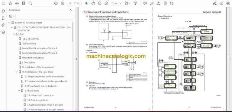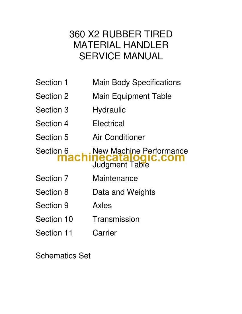 Out in scrap yards, ports, and log yards, this 360X2 rubber-tired material handler spends its life creeping, grabbing, and swinging under load. This service manual is what I’d pull when I need to trace a drive issue or sort out why the machine won’t move right after a hard day in rough ground. For example, if the handler starts hesitating when you shift or feels weak on travel, this book walks you through a logical path to isolate whether it’s in the transmission, the hydrostatic side, or a control problem before you start throwing parts at it.