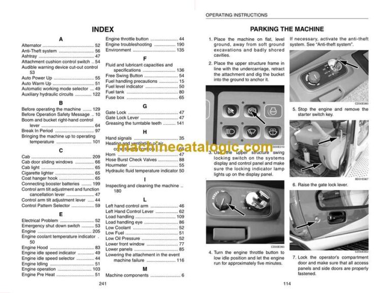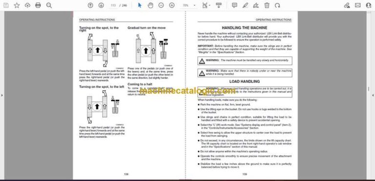 On a big excavator like the Link Belt 460LX, you’re usually digging deep cuts, loading trucks, or trenching in rough sites where mistakes get expensive fast. This operators manual is what I’d keep handy to run the machine the way it was meant to be run—right startup, correct shutdown, and the daily walk‑around checks that keep you out of trouble. If, for example, the boom feels sluggish on a cold morning, I’d use this book to verify the proper warm‑up routine and control settings before anyone starts blaming pumps or valves.