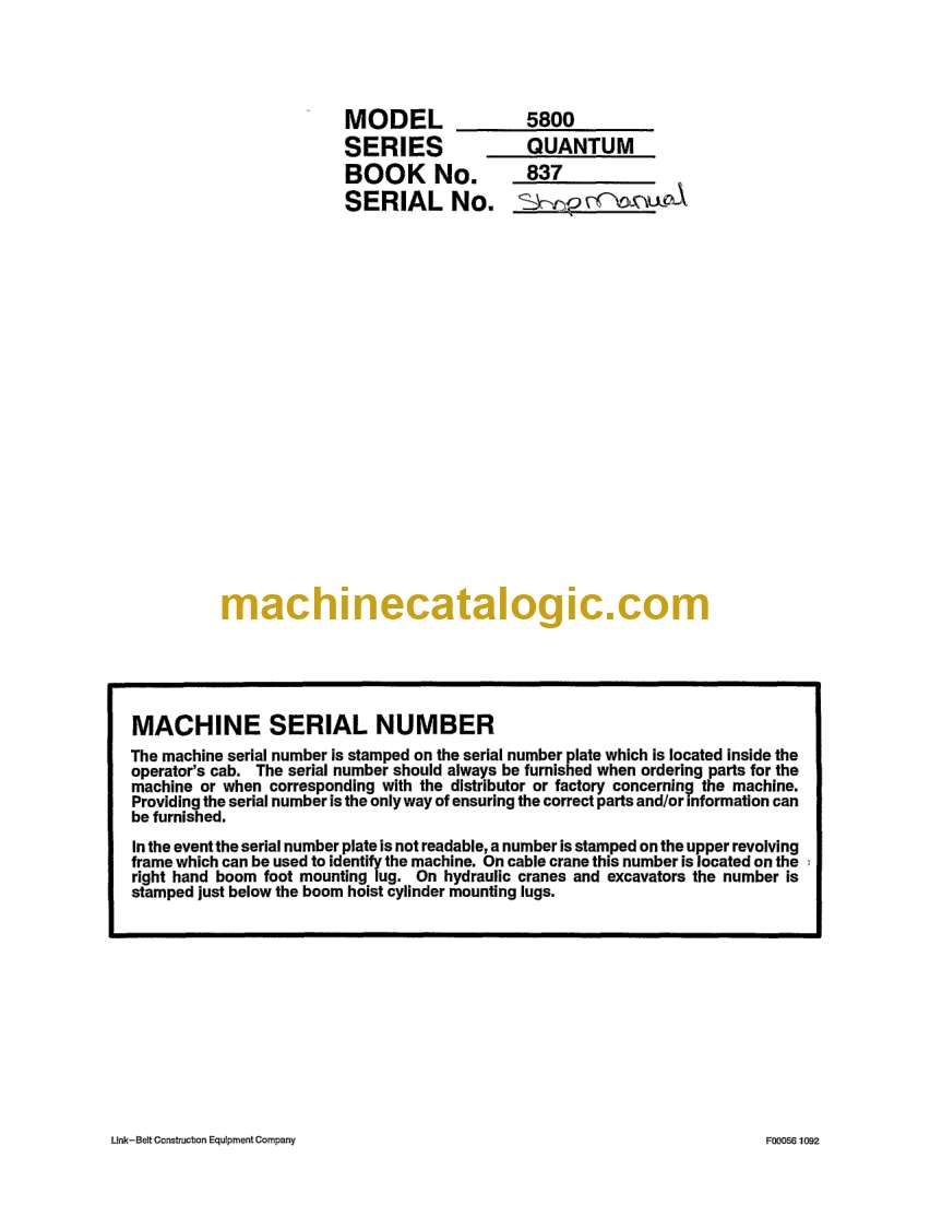 Link Belt 5800Q Quantum Excavator Shop Manual