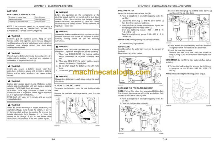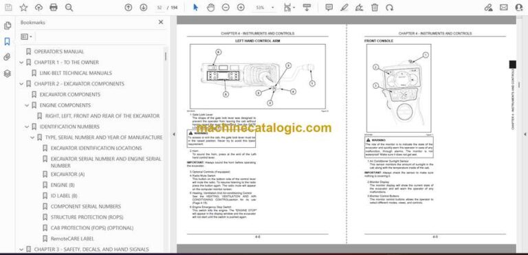 This manual is what I’d keep in the cab of a Link Belt 80X3 that’s doing trenching, backfilling, and tight-site digging around utilities or foundations. It walks you through how to run the controls correctly, what to check before you start your shift, and how to shut the machine down without abusing the hydraulics or engine. If an operator complains that the machine feels “sluggish” or the swing is jerky after startup, this is the book I’d use to verify warm‑up steps, mode settings, and basic checks before assuming there’s a major failure.