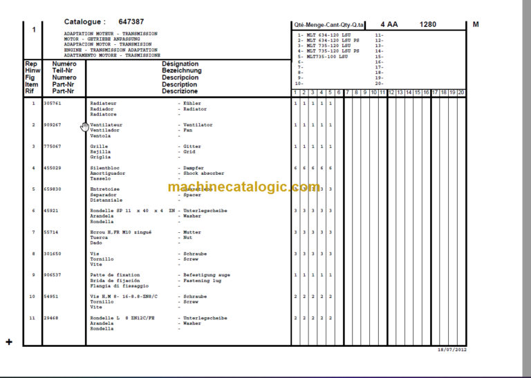 Manitou MLT 634-120 LSU Série G-E3 PARTS CATALOGUE includes high-quality images, diagrams, and instructions to help you understand and repair spare part numbers and arrangements. This document can be printed without any restrictions and contains searchable text and bookmarks for easy navigation.