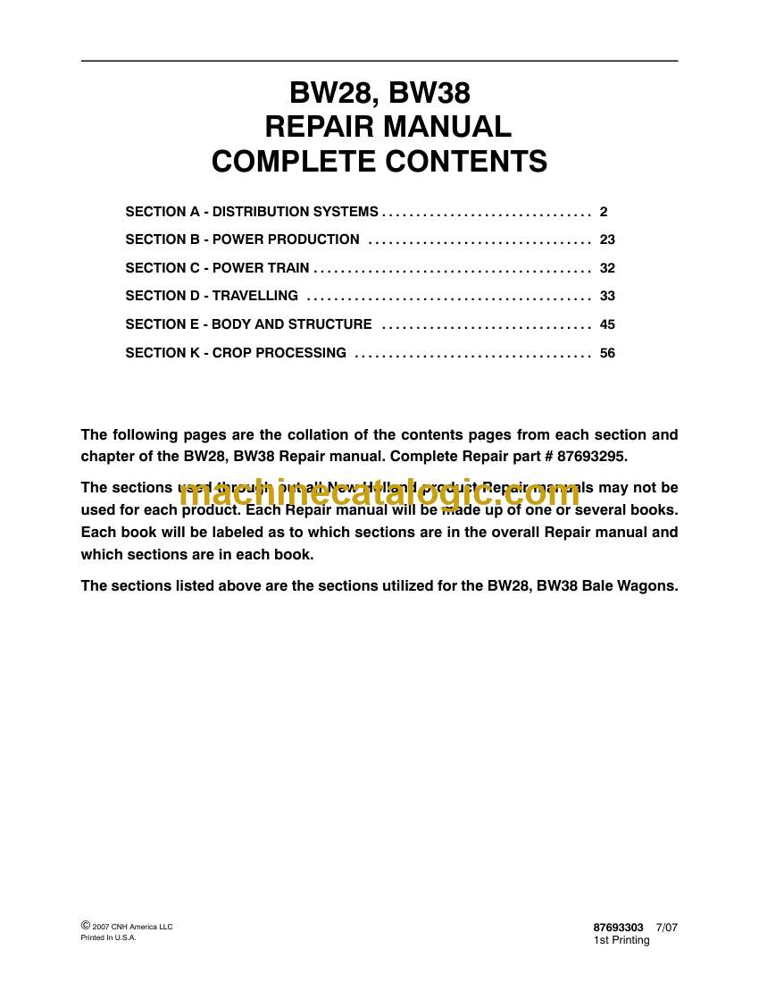 New Holland BW28, BW38 Bale Wagon Repair Manual (87693295)
