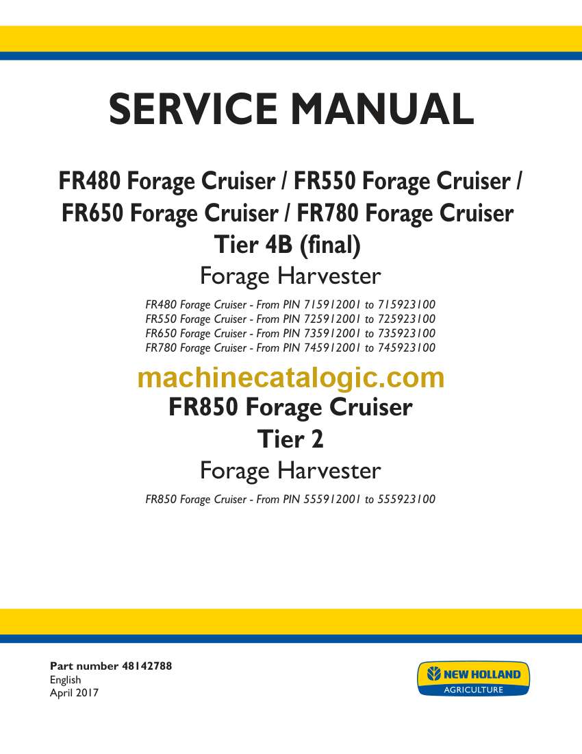 New Holland FR480, FR550, FR650, FR780, FR950 Forage Cruiser Forage Harvester Service Manual (48142788)