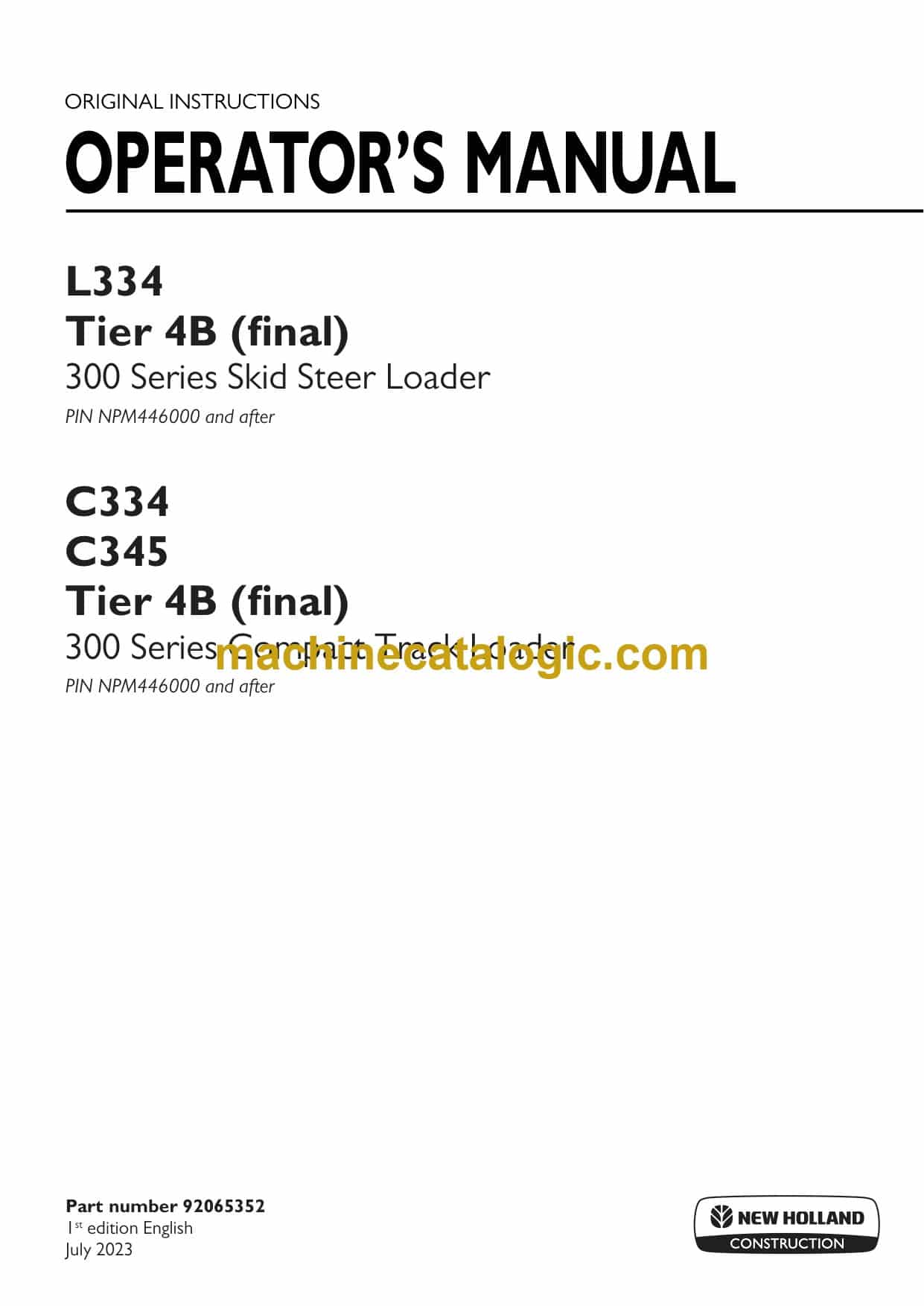 New Holland L334 Tier 4B Final 300 Series Skid Steer Loader and C334 C345 Tier 4B Final 300 Series Compact Track Loader Operators Manual