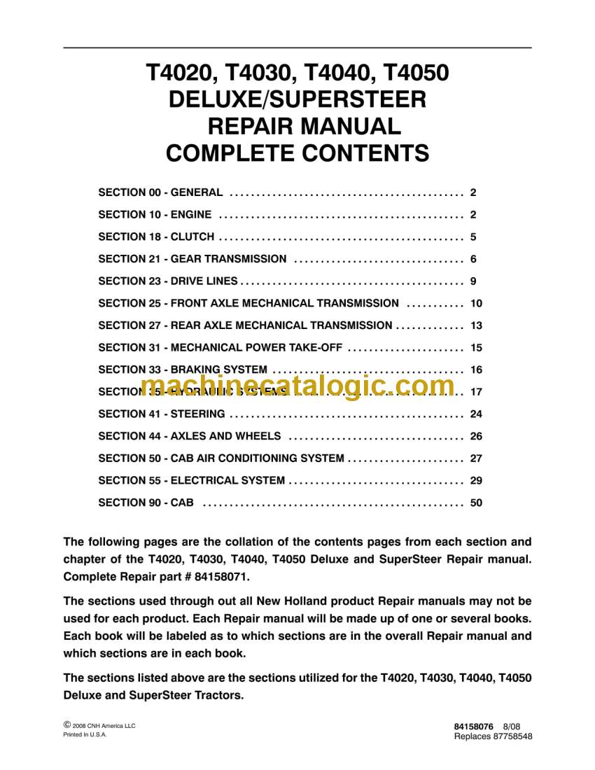 New Holland T4020, T4030, T4040, T4050 Deluxe, Supersteer Repair Manual (84158071)