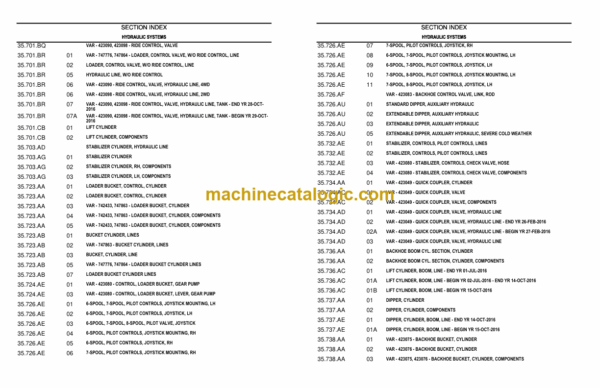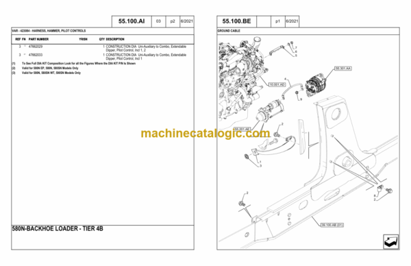 On a 580N Tier 4B backhoe that spends its life trenching, loading trucks, and working around utilities, this parts catalog is what I’d keep open on the bench or laptop whenever something’s worn, bent, or missing. It lets you visually break down assemblies, match what’s on the machine to the right part number, and avoid guessing. Say you’ve got slop in a stabilizer leg—this book helps you trace every bushing, pin, shim, and seal in that leg so you order everything you’ll need in one shot.