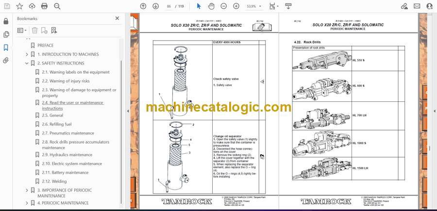 B 22300–1 GB 0497 HL 700 series hydraulic rock drill; Maintenance