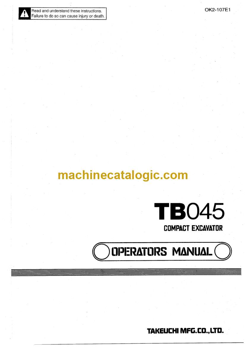 On a TB045 working in tight residential lots or rough utility trenches, this operators manual is what I’d keep handy to run the machine without abusing it. It walks you through how the controls should feel, how the excavator should respond under load, and what to check each day so you don’t discover a problem halfway through a dig. If, for example, the machine starts feeling unstable when you’re swinging a full bucket on a slope, this is the guide you use to verify your operating position, boom and blade setup, and basic checks before calling it a “hydraulic problem.”