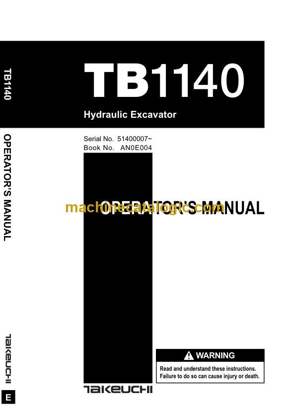 On a TB1140 working in tight urban sites or rough utility trenches, this operators manual is what I’d keep handy to run the machine efficiently without beating it up. It walks you through what every control and indicator is telling you, how the excavator should feel under load, and what to check each day before you swing over traffic or a trench. If, for example, the machine feels sluggish when tracking up a slope or the boom movement gets jerky, I’d use this manual to verify operating modes, check the display warnings, and confirm I’m not running it in a way that will shorten component life.