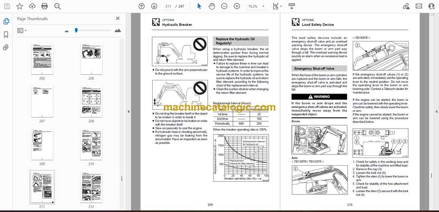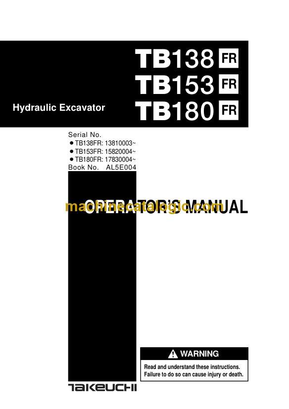 On these Takeuchi FR excavators you’re usually working tight jobsites—street repairs, foundation work, utilities—often on uneven ground with people and traffic nearby. This operators manual is what I keep handy to run the machine the way it was designed, without beating it up. It walks you through what each control does, how the machine should feel under load, and the daily checks that keep you from losing a shift to a simple fault. If, for example, the upper structure is slow to swing or feels jumpy when you’re tucked in close to a wall, this is the book I use to verify control settings and correct operating procedure before I start blaming components.