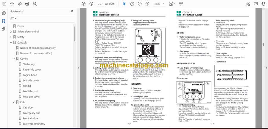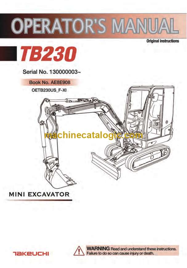 On a TB230 working in tight residential lots or on rough commercial sites, this operators manual is what I’d keep handy to run the machine correctly and avoid beating it up. It walks you through what each control does, how the excavator should feel under load, and what to check before and after a shift. If, for example, the machine starts feeling “tippy” when you’re trenching along a slope, this is the document I’d use to verify operating positions, blade use, and safe travel habits before assuming something is mechanically wrong.