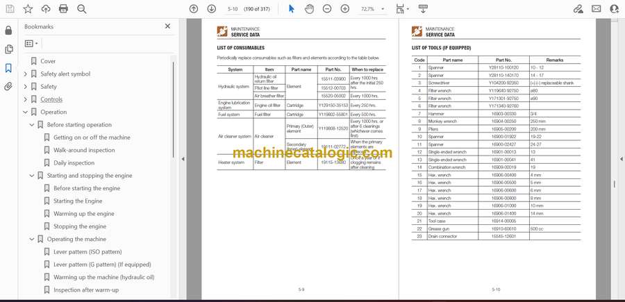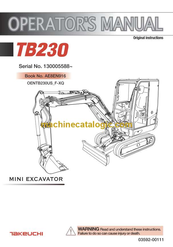 On a TB230 working in tight residential lots or small commercial sites, this operators manual is what we use to run the machine correctly day to day. It helps you understand what every control does, how the excavator should feel under load, and what to check before you start digging on uneven or soft ground. If, for example, the machine feels unstable when you swing with a full bucket on a slope, this book walks you through proper operating posture, travel position, and basic checks so you can correct the issue before something bends or tips.
