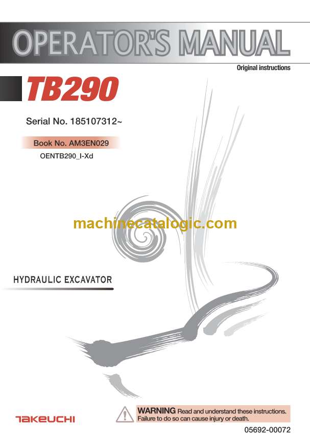 Takeuchi TB290 Hydraulic Excavator Operators Manual (AM3EN029) (SN 185107312-)
