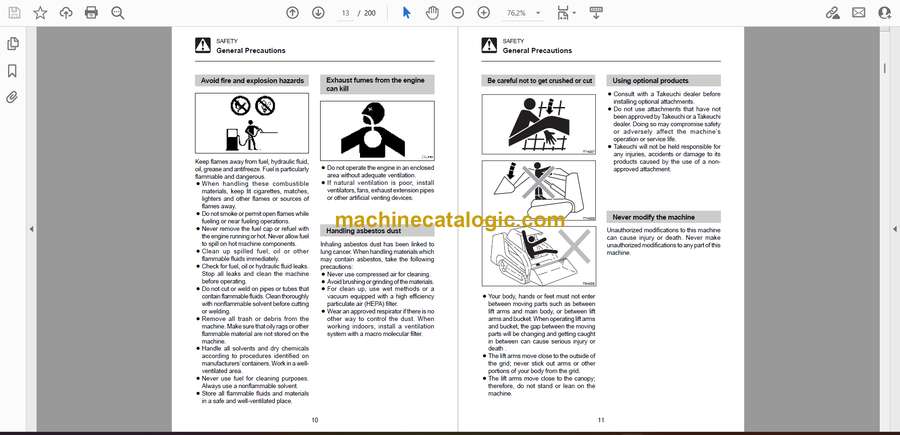 On these Takeuchi TL220–TL250 track loaders, you’re usually grading pads, loading trucks, or backfilling on tight, uneven jobsites. This operators manual is what I keep handy to explain what every control does, how the machine should “feel” under load, and what to check before and after a shift. If, for example, the loader starts nosing down on a slope or feels jerky when you curl the bucket, this book helps you verify your operating technique and daily checks before assuming something is broken.