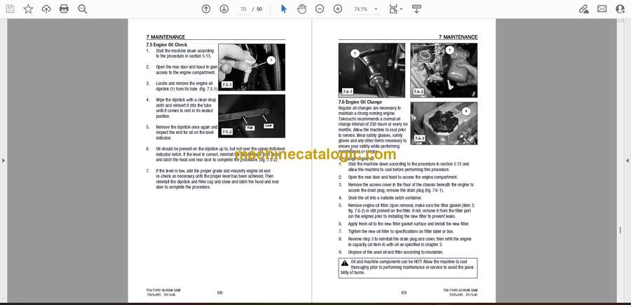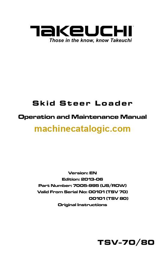 These TSV70 and TSV80 skid steers usually live in mud, dust, and tight spaces—loading trucks, grading pads, feeding hoppers, and cleaning up demolition. This Operation and Maintenance Manual is what I keep handy to set a solid service rhythm: when to grease, what to inspect, and how to operate so the machine stays predictable day after day. If, for example, the loader starts feeling sluggish or jerky in the hydraulics, I use this book to walk through basic checks, verify daily/weekly service points, and rule out simple causes before we start tearing into components.