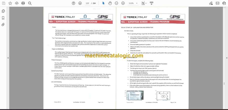 The Terex 693+ Supertrak is a high-performance screening machine used in quarrying, mining, and aggregate production. This Operation Manual explains material flow behavior, screenbox adjustments, hydraulic conveyor functions, engine load management, and setup procedures for varying screening applications. Operators rely on it to optimize throughput and maintain consistent particle separation.