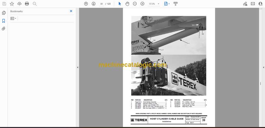 The Terex BT7000 Crane is a truck-mounted lifting machine built for demanding job sites that require mobility and reliable lift performance. This Parts Manual lays out the crane’s internal structure through detailed exploded diagrams of the boom assembly, slewing system, outriggers, hydraulic cylinders, and driveline components. Technicians depend on this guide to trace part numbers precisely and avoid mismatched replacements during maintenance.